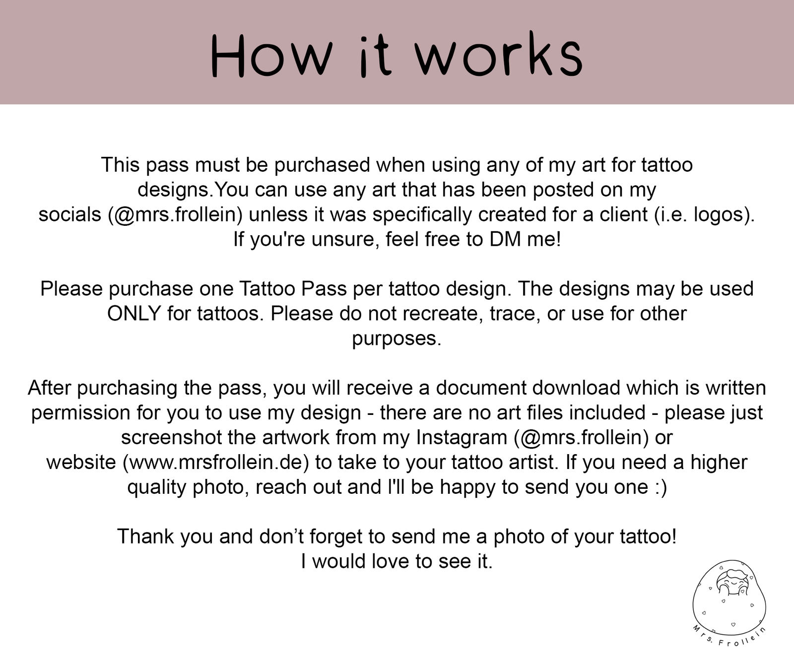• This pass must be purchased when using any of the Mrs.Frollein art for tattoo designs.